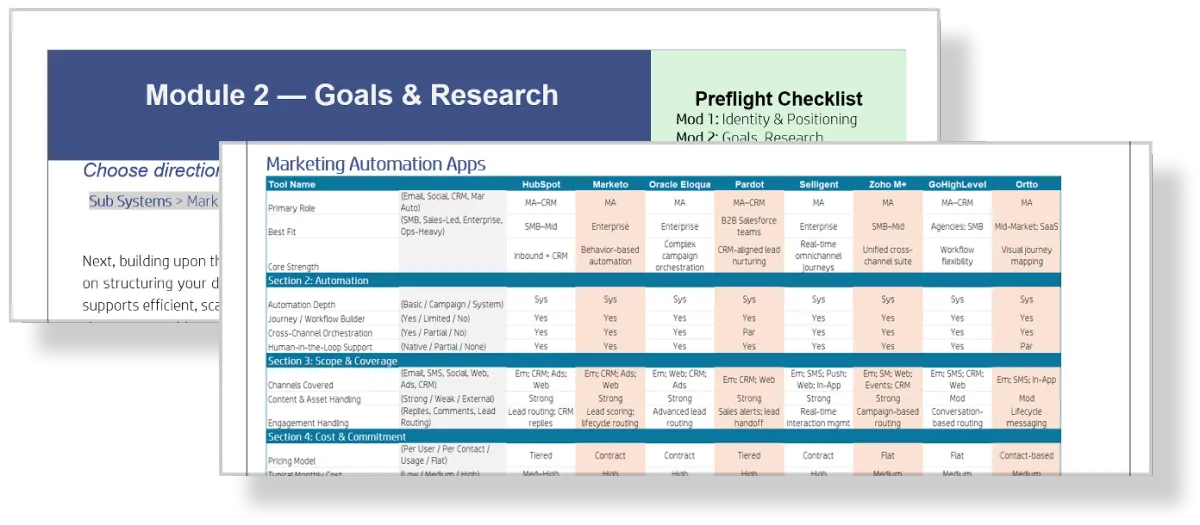 Marketing Automation Comparison Charts — side-by-side breakdowns of platforms like HubSpot, Zoho, GoHighLevel, ClickUp, and others to reveal real system capabilities.